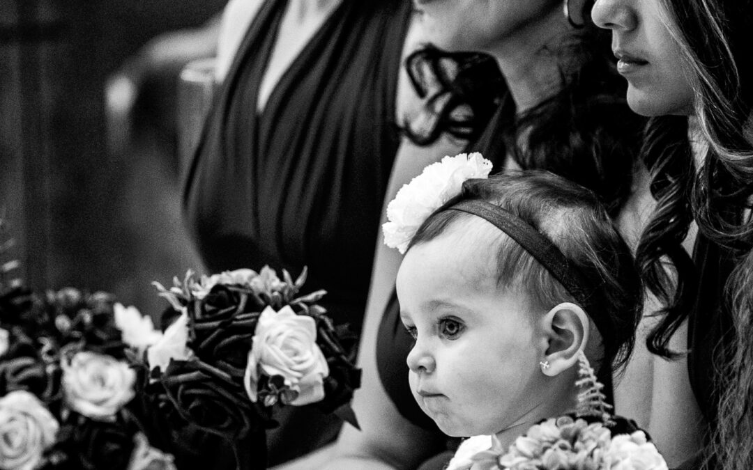 Flower girl with bridesmaids black and white in church