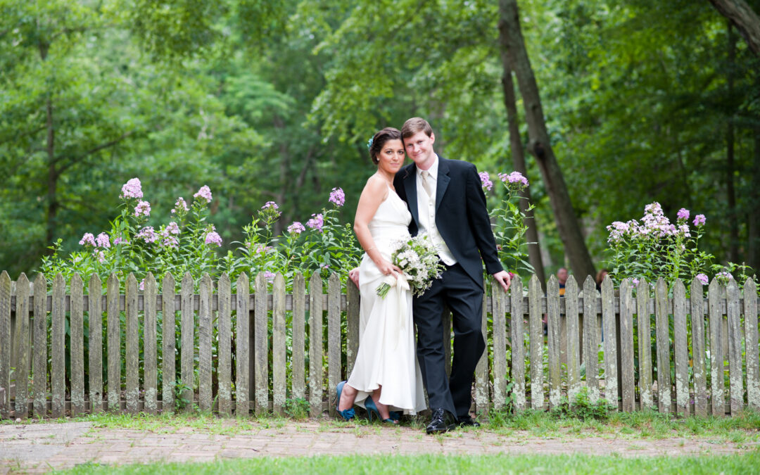 bride and groom in park by fence and flowers allaire park village