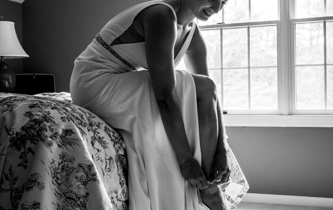 Bride black and white putting shoe on