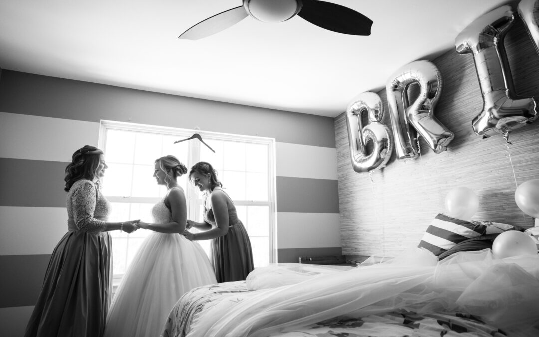 Bride getting dressed with help from mom