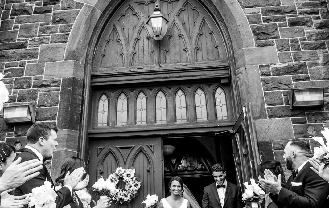 Bride and groom black and white coming out of church doors